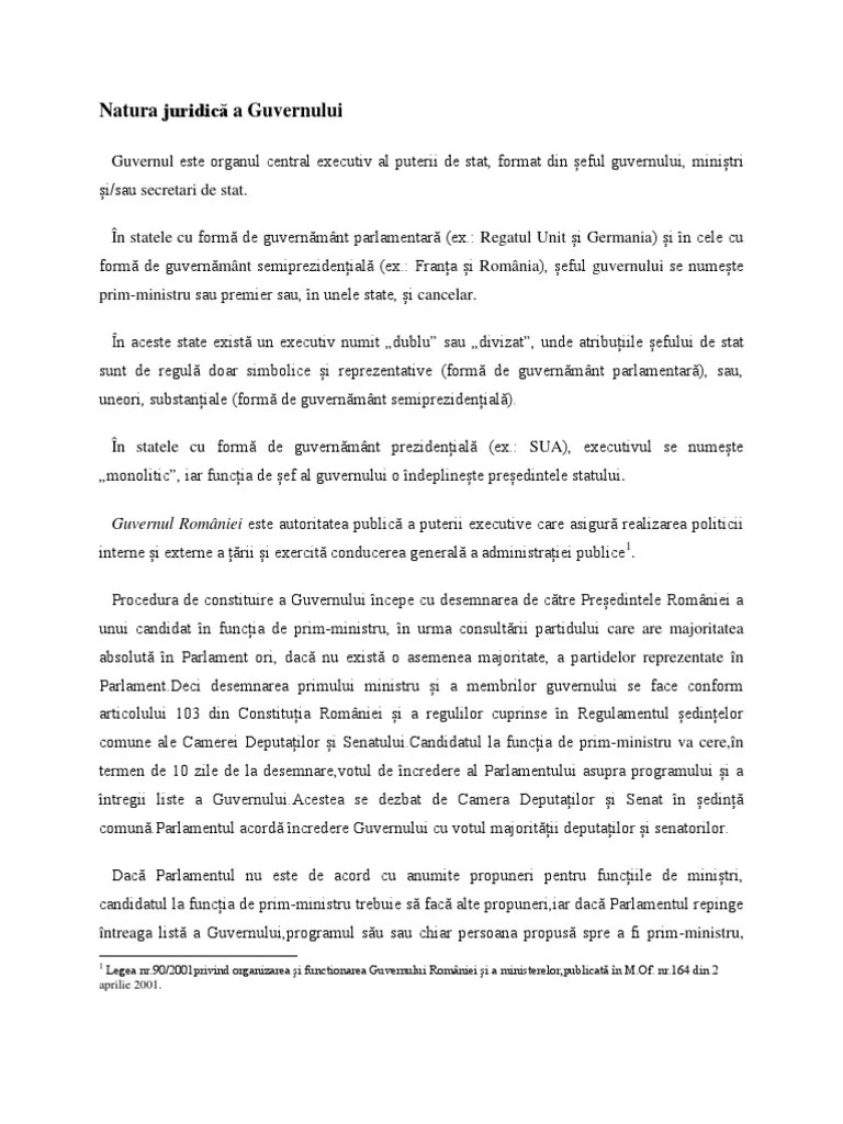 Guvernul romaniei este organizat si functioneaza in baza legii nr.90/2001 privind organizarea si functionarea guvernului romaniei si a ministerelor,modificata si completata prin o.u.g. Guvernul exercita puterea executiva la nivel central, asigura realizarea programului de guvernare si conduce administratia publica a statului. 7.functionarea guvernului si actele acestuia 8. Această competenţă îi revine preşedintelui româniei, în urma consultării partidului care are majoritatea absolută în parlament. Cel mai tare site de referate din romania. A) exercită conducerea generală a administraţiei publice;. Pentru realizarea programului de guvernare guvernul exercita urmatoarele functii: